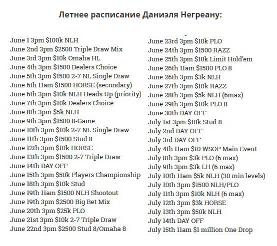 Даниэль Негреану входит в число самых успешных игроков. Он активно продолжает принимать участие в живых турнирах. Попутно он успевает вести свой блог FullContactPoker, где недавно опубликовал свое расписание на лето. В нем запланировано принять участие в 39 ивентах. Общий вступительный взнос к ним составляет нешуточную сумму – $1,414,500.