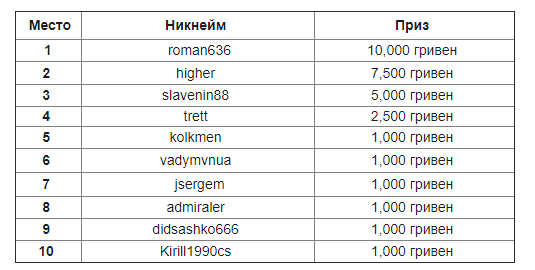 По итогам отыгрыша бесплатных ивентов было определено 100 лучших игроков. Они получили дополнительные призовые. Среди них было распределено 50 000 гривен. Таблица 10 лучших игроков выглядит следующим образом: