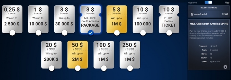 ПартиПокер не перестает проводить обновления. На этот раз апгрейд коснулся семейства SPINS. К предстоящему MILLIONS в Бразилии линейка SPINS пополнилась специальной версией турниров со взносом $3. Их особенность заключается в топ-множителе, предусматривающим розыгрыш путевки на живую серю. Общая стоимость пакета составляет $12 000, куда входит оплата бай-ина на Главное Событие, проживание в гостинице, трансфер и другие накладные расходы.