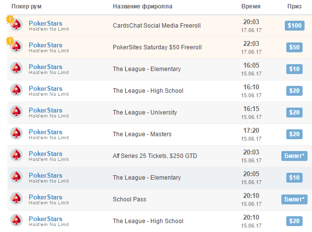 Фрироллы в ПокерСтарс проходят каждый час. Некоторые из них предусматривают доступ по паролям, а другие требуют только подачи заявки на участие. Призовые фонды к бесплатным турнирам достигают 5 000 долларов. С их расписанием можно ознакомиться в турнирном лобби игрового клиента.