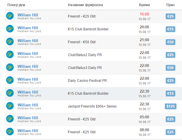 Данный покер-рум один из самых старейших. Он смог создать привлекательные условия для своих клиентов. Ежедневно каждые два часа в William Hill Poker проходят фрироллы. Регистрация в них доступна без паролей и выполнения каких-либо условий. Размер призовых фондов в них достигает 50 евро.