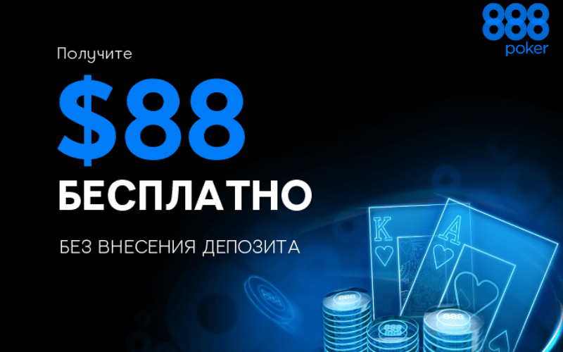 888Poker – зарубежная онлайн-комната, зачисляющая новому клиенту бездепозитный бонус в $88 на турнирную и кеш-игру. Для получения бездепа пройдите регистрацию, подтвердите создание аккаунта и получите на счет игрового аккаунта первую часть бонуса в $8. После отыгрыша первого, начисляются следующие $8 и так далее.