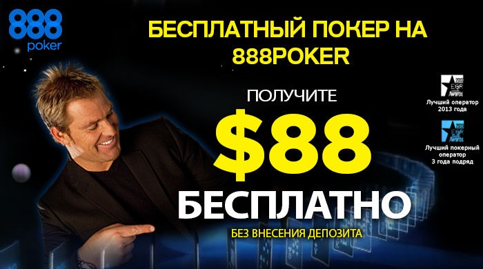 - 888Покер – зарубежная покерная комната, зачисляющая новому клиенту $88 в качестве бездепозитного бонуса для принятия участия в турнирах и отыгрыша раздач за кеш-столами.