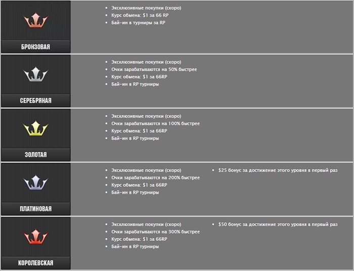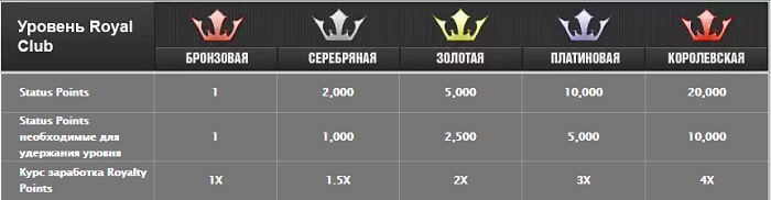 Отыгрывая раздачи и принимая участия в турнирах, покерист будет получать баллы лояльности. Чем больше удастся собрать, тем выше будет королевский статус в руме. А значит, игрок сможет получить больше выгод. Представляем вашему вниманию таблицу с необходимым количеством поинтов для получения того или иного статуса: