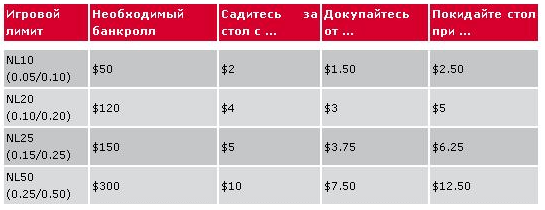 Покеристам рекомендуется рассматривать деньги, вкладываемые в игру, как инвестиции. Но чтобы они работали, у вас должен быть достаточный запас. И здесь речь идет не о десяти раздачах, а о куда большем количестве. Рекомендуем при банкролл-менеджменте руководствоваться следующей таблицей: