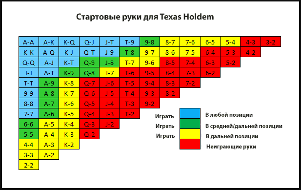Конечно, новичкам очень сложно сразу начать правильно оценивать силу своих карт, еще и одновременно с этим учитывать свою позицию за столом. Но есть один секрет игры в покер Техасский Холдем, который упростит такую задачу – готовый чарт стартовых рук. В нем расписаны действия в торгах для каждой ситуации в зависимости от карт и позиции.