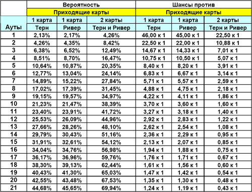 Для расчета вероятности получения нужных аутов на той или иной улице и вычисления шансов банка можно использовать формулы или специальные калькуляторы. Но самый оптимальный вариант – готовые таблицы с вычислениями. Вот одна из них: