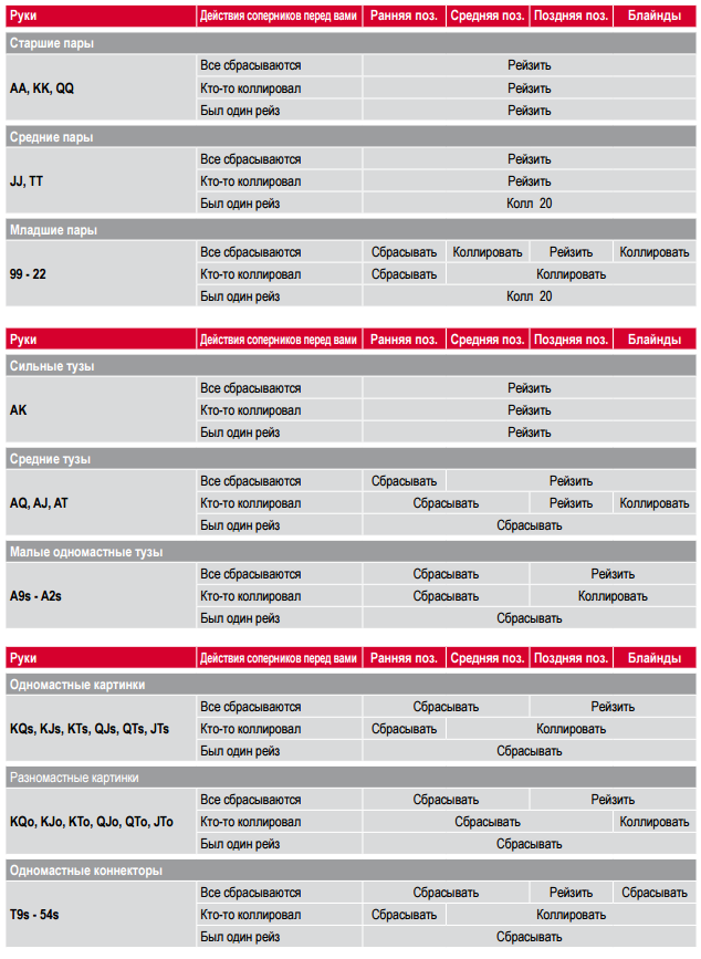 Но как новичку начать с успехом выбирать карманные карты для входа в игру и при этом правильно оценивать свою позицию? Рекомендуем пользоваться специальной таблицей. В ней отмечено – с какими руками и в какой позиции следует входить в торги: