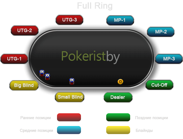 Различают ранние, средние и поздние позиции. Они проиллюстрированы на рисунке выше. Чем более позднюю позицию занимает покерист, тем более в выгодном положении он оказывается. Он уже имеет представление о решениях большинства соперников, что позволяет составить примерную картину о силе их рук.