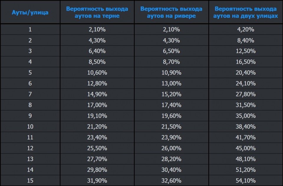 В первую очередь игрок должен уметь правильно рассчитывать ауты. Под ними понимаются карты, которые есть в колоде и могут помочь достроить или усилить комбинацию.