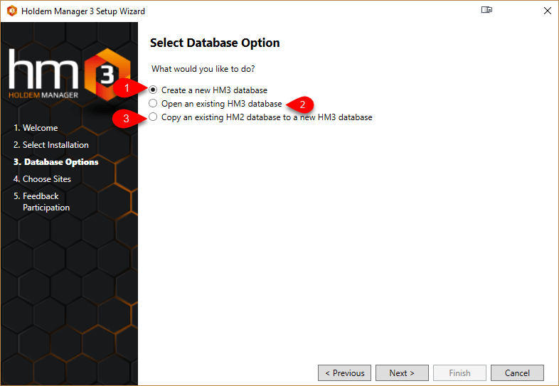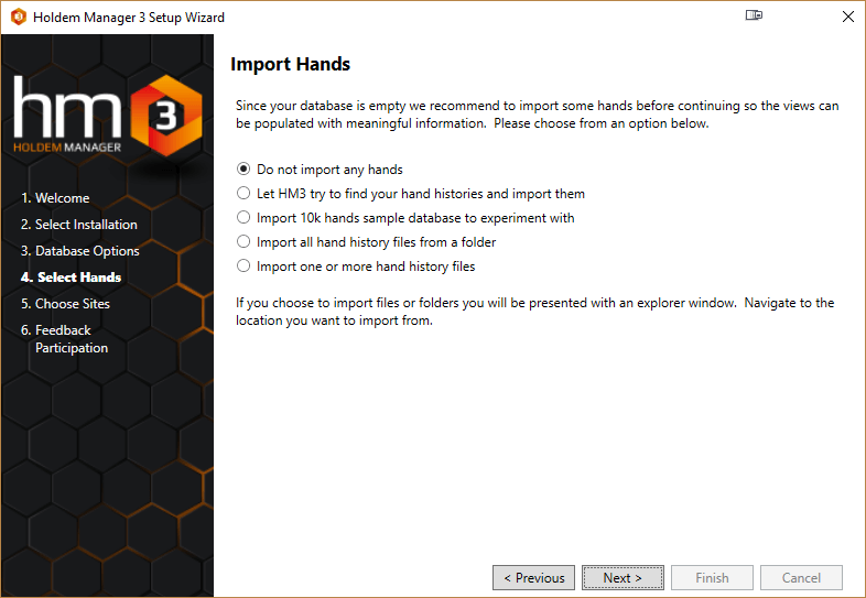 Теперь вам будет предложено создать новую базу данных для HM, если ранее у вас ее не было. Вам потребуется выбрать место на своем компьютере, где она будет храниться, а также дать ей название. Нажав на кнопку «Next», вам будет предложено импортировать историю рук в приложение: