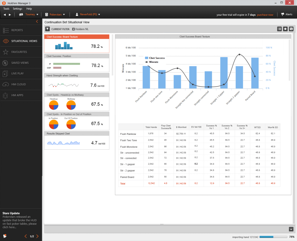 - Situational views. Данная вкладка появилась только в третьей версии софта. В ней можно получить исчерпывающую информацию по своей игре, которая связана с продолженными ставками, 3-бетами и выставлениями в турнирных состязаниях.