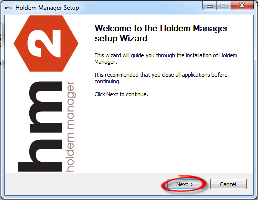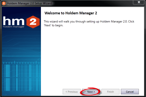 Теперь перейдем к инструкции по настройке Холдем Менеджер 2. Когда программа будет инсталлирована, то на рабочем столе вашего компьютера появится фирменный значок. Кликните по нему, чтобы запустить приложение. В открывшемся окне нажмите на «Next».
