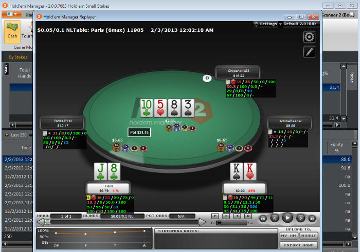 Многие игроки используют при отыгрыше раздач вспомогательный софт. Чаще всего в роли него выступает Холдем Менеджер. Популярность такого приложения среди покеристов объясняется оптимальным соотношением функциональности и цены. Главная задача этого софта – повышение прибыли от игры. Такой эффект обеспечивается за счет наличия в нем целого спектра инструментов. С их помощью происходит оперативный сбор, вывод и анализ статистики по игре оппонентов и самого пользователя.