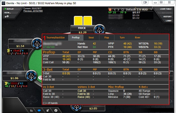 Благодаря наличию HUD напротив ника каждого соперника отображаются важные цифровые показатели. По ним можно понять, как часто тот или иной опонент делает фолд на флопе, крадет блайнды с баттона, отвечает на крупные резы и так далее.