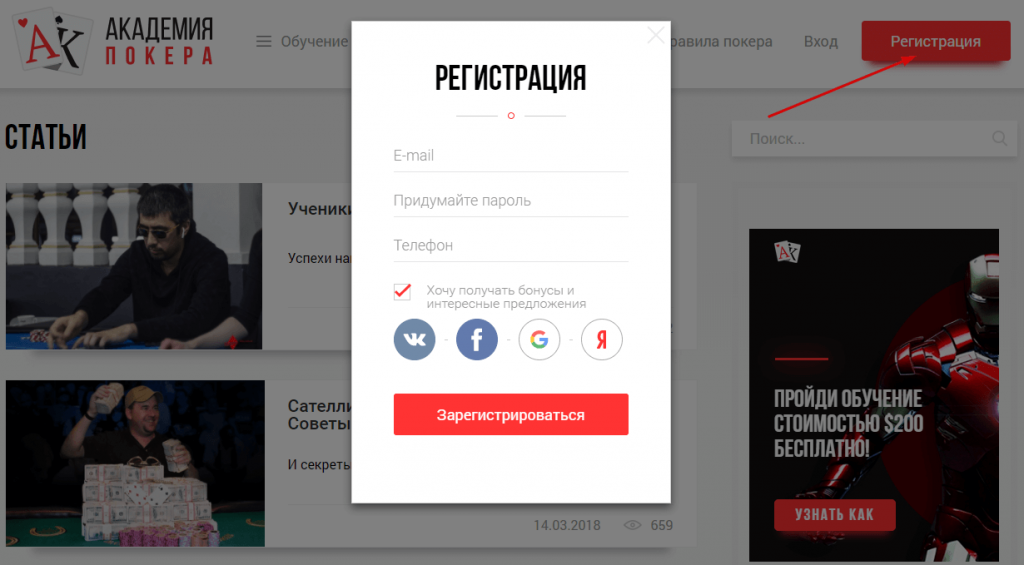 От пользователя требуется заполнить эту форму или же авторизоваться на сайте посредством профиля от одной из социальных сетей. После этого вам станет доступен весь функционал сайта покерной школы.