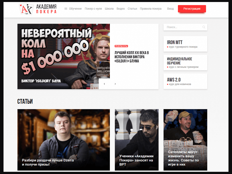 Академия Покера – это одна из самых популярных школ покера. Она была открыта более 8 лет назад. За это время в ней прошло обучение более 50 000 человек. Многие из выпускников этой школы смогли добиться впечатляющих результатов в онлайн и оффлайн игре.