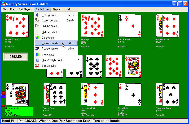 - Showtime – отыгрыш раздач проходит по классическим правилам, за исключением одного: сброшенные карты сразу показываются участникам – легче просчитывать ауты и оценивать вероятности усиления руки.
