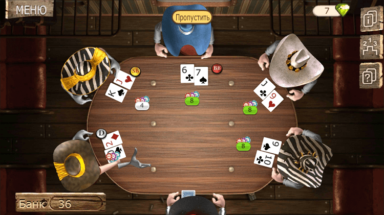 Красочное приложение с квестовой составляющей. Игра переносит на Дикий Запад – родину Техасского Холдема. Главная задача покериста – обыграть в решающей раздаче губернатора штата, получив его пост.