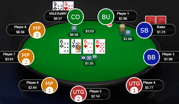 Ситуация в раздаче на префлопе с 3 бет: сначала проставляются блайнды, далее один оппонент делает рейз, следующий переповышает предыдущий рейз.