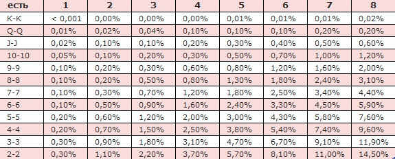 Пара тузов – самый сильный стартер, который дает серьезное преимущество над противниками. Вероятности прихода такой руки отражен в отдельной таблице в зависимости от количества соперников: