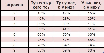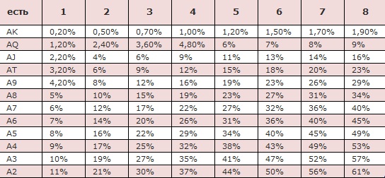 Туз открывает хорошие перспективы на победу в раздаче, но важно также учитывать вторую карту. Сила руки прямо пропорциональна ей. Вероятности получения к тузу той или иной фигуры отражены в этой таблице с учетом количества соперников: