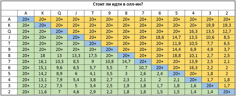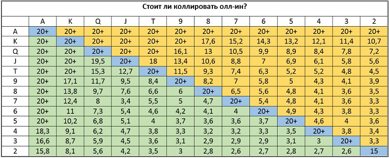 Цифры в таблице показываются, при каком максимальном стеке целесообразно делать олл-ин. Допустим, в ячейке указана цифра 13 – значит, ставьте все фишки, если в вашем стеке 13 и менее больших блайндов.