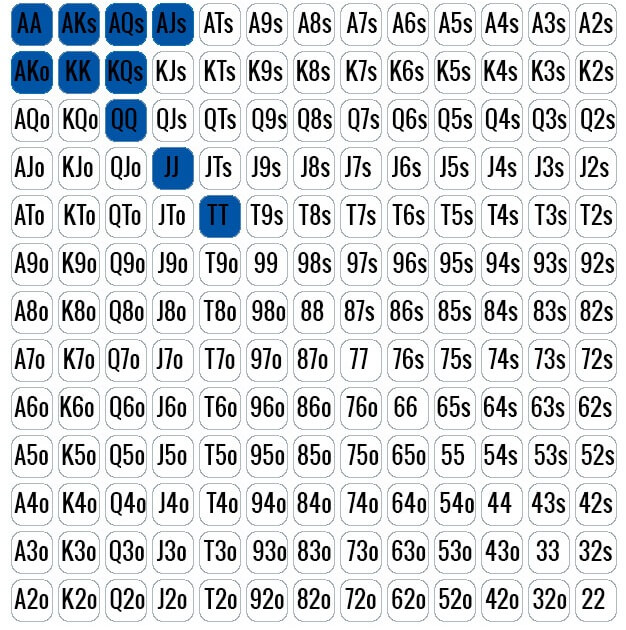 Начнем с основных схем. Первая из них – это чарт премиальных рук. С ними можно входить в игру с любой позиции. Обычно розыгрыш таких стартеров происходит агрессивно – сопровождается крупными рейзами: