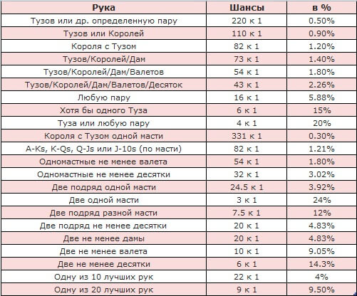 Многие опытные игроки пользуются таблицами с вероятностями прихода тех или иных карт на первой улице. Зачем они необходимы? Чтобы верно оценивать силу своей руки на префлопе. Зная, как часто с раздачи приходят полученные карты, вам будет проще принять решения о входе в торги. Представляем соответствующую таблицу: