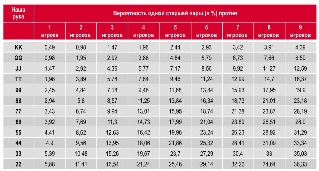 Вероятность выигрыша в покере зависит также от того, карты какого ранга образовали карманную пару. Чем выше номинал фигур, тем более высокие шансы на победу: