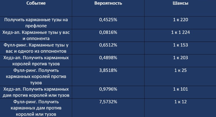 С тузами на руках до флопа игроку нечего бояться. Но когда получены карманные кары, то стоит опасаться у соперников наличия тузов. В хедз-апе у вашего противника будет оказываться более сильная рука в одной из 200 раздач. Но если вы за фулл-ринг столом с 8 соперниками, что вероятность того, что против ваших карманных королей выступит пара тузов составляет 1 к 25.