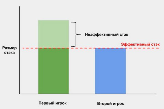 У вашего противника в распоряжении $80, а у вас - $100. Если вы решите пойти олл-ин, то сможете использовать только 80 долларов, так как оппонент не сможет вложить аналогичную сумму в пот, так как у него нет больше денег. А значит, при расчете прибыли от ставки против соперника нужно брать сумму в 80 долларов, а не в 100. Именно $80 и будет выступать в качестве эффективного стека в этой раздаче.