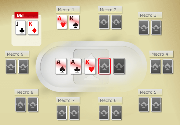 - сильная рука, но с небольшими шансами на проигрыш – у противников есть возможность усилиться за счет следующих улиц, из-за чего ваша комбинация потеряет ценность. В этом случае предложите соперникам задорого смотреть следующую карту;