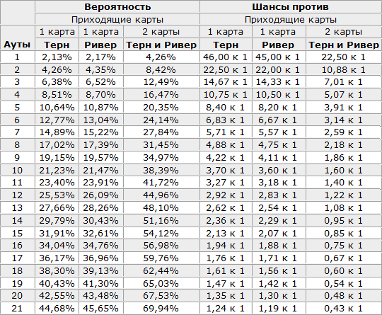 При принятии решений на этом этапе также нужно опираться на покерную математику, рассчитывая вероятности. Так, например, при наличии дро-руки вы должны знать, какие у вас шансы на ее улучшение на следующих улицах. Вычислив шансы банка, сможете понять, окажется ли ставка прибыльной на дистанции. Можно проводить все расчеты самостоятельно или пользоваться таблицами с готовыми вычислениями: