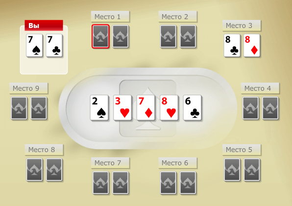 Борд открывает разномастные карты низкого номинала. Открывшиеся фигуры не усилят предполагаемую руку соперника высокого ранга. У вас Сет из семерок – комбинация, дающая высокие шансы на выигрыши в сложившемся борде.