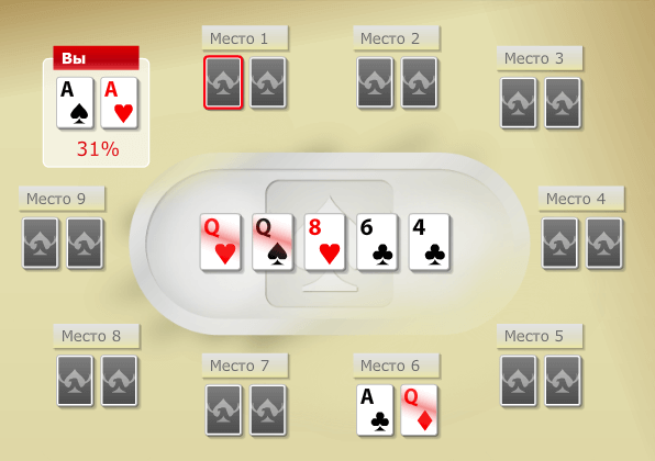 Пример 3: Вам на баттоне приходит АА. Противник на средней позиции делает рейз, вы отвечаете ре-рейзом, получая колл. Флоп открывает пару дам. Оппонент пропускает ход, вы делаете ставку и получаете колл. На терне ситуация аналогична.