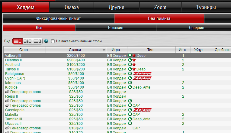 - Высокие. Беты от NL400 и выше. За столами собираются самые сильные и опасные соперники, успешно выступающие на живых покерных сериях WSOP и EPT. Банки нередко превышают несколько тысяч долларов. От игрока требуется многолетний опыт и большой банкролл, чтобы успешно играть на NL400 и выше.