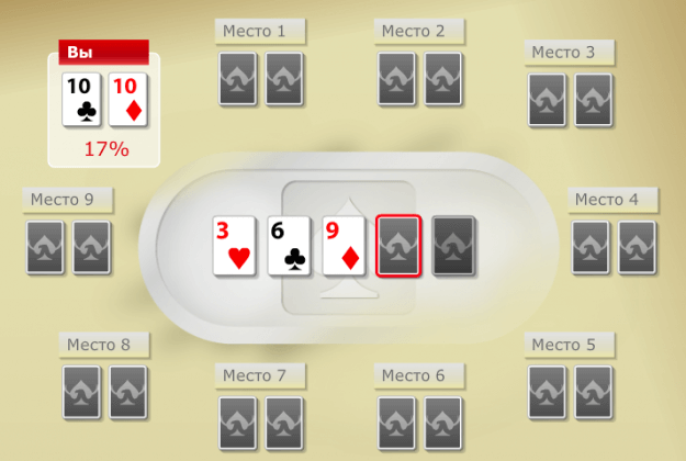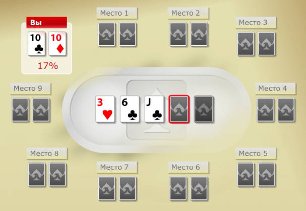 Покеристу не удалось собрать оверпару из-за открывшегося на борде Валета. Он старше карманных Десяток. Противники могут собрать пару на Валетах, о чем следует помнить.