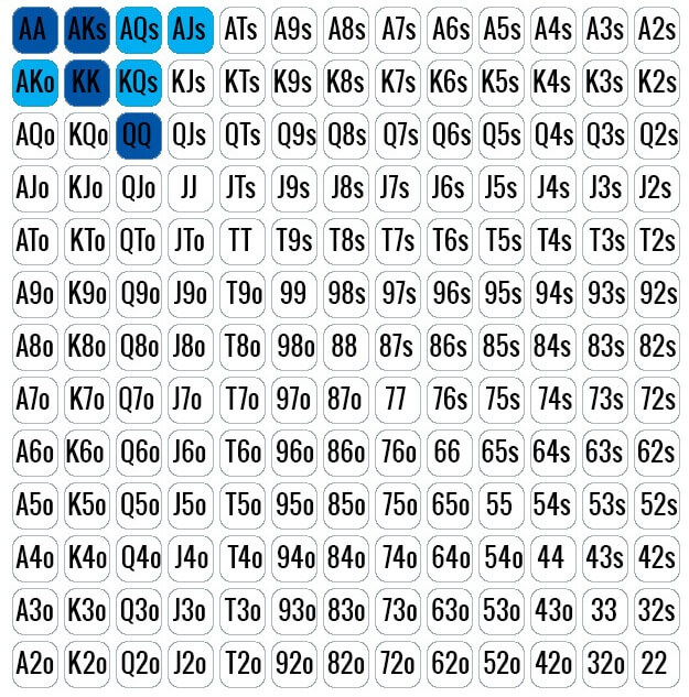 - стратегии глубоких стеков – в распоряжении покериста большое количество фишек, требующее максимального сужения разыгрываемых стартеров. Входя в раздачу с картами ниже премиальных, высок риск крупных потерь. Розыгрыш рук средней силы с вероятностью победы более 50% на дистанции оборачивается убытками из-за дисперсии. Для прибыльной реализации стратегии глубоких стеков игроки опираются на таблицу: