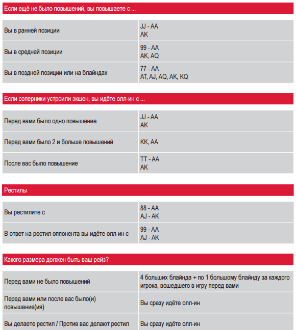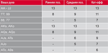 - стратегии коротких стеков – в распоряжении игрока небольшое количество фишек, позволяющие входить в раздачу с широким спектром рук ввиду невысоких рисков. При принятии решений игроки руководствуются следующей таблицей: