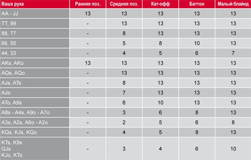 Когда вы не делали обязательных ставок, другие противники вносили фишки в банк, руководствуйтесь чартом: