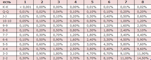 - Выбить соперников из игры. Когда покеристу пришли перспективные карты на префлопе, то для сохранения их ценности нужно вынудить как можно большее количество соперников уйти в пас. Сделать это можно путем повышения – такую ставку не поддержат все те, кому пришли слабые карты. В итоге на постфлоп зайдет один или два игрока. В этой таблице наглядно видно, как меняется ценность руки в зависимости от того, сколько противников осталось в раздаче: