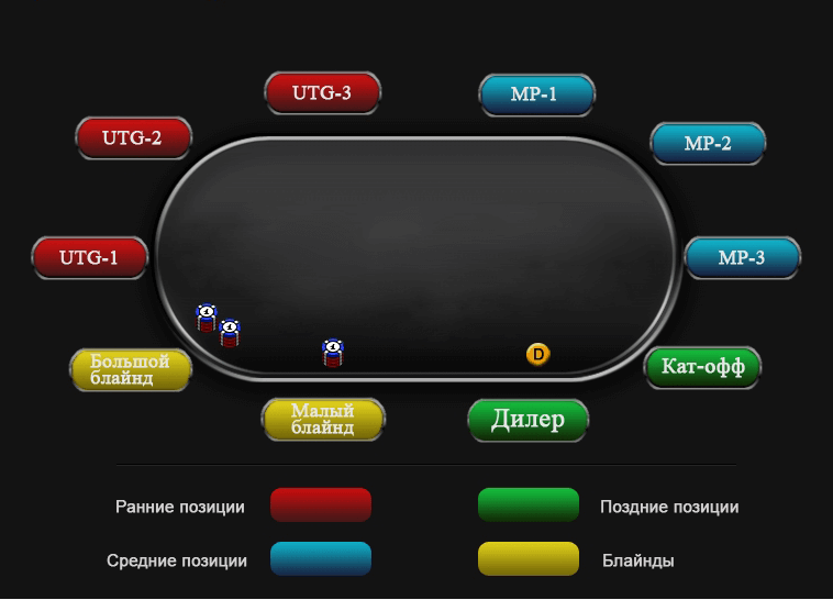 В покерной литературе используется аббревиатура UTG – расшифровывается, как under the gun – «под прицелом», означая места слева от блайндов. Позиции относятся к ранним, количество варьируется в зависимости от формата стола. В 9-max три ранних позиции, за 6-max – одна.