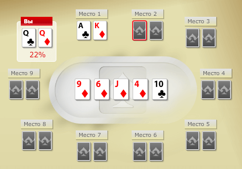 - если у вас есть четыре одномастных фигуры, то вероятность после замены получить готовую руку составляет около 19%.
