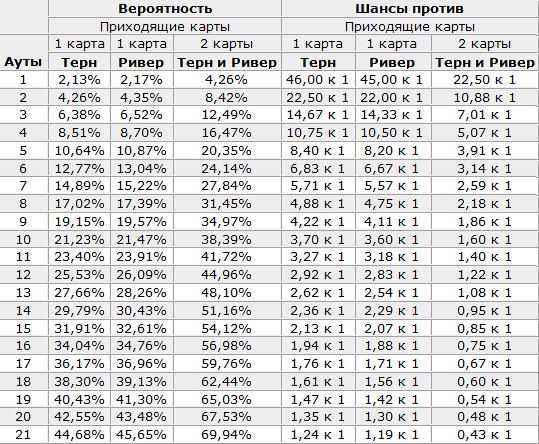 Впрочем, можно и не производить все эти расчеты самостоятельно. Уже есть готовые таблицы со всеми необходимыми вычислениями. Их рекомендуется распечатать и держать перед глазами во время отыгрыша раздач. Вот одна из таких таблиц: