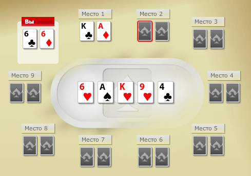 Давайте рассмотрим наглядный пример такого сочетания. Здесь у игрока есть пара из шестерок, а на борде есть только одна фигура, которая помогает в построении нужного расклада: