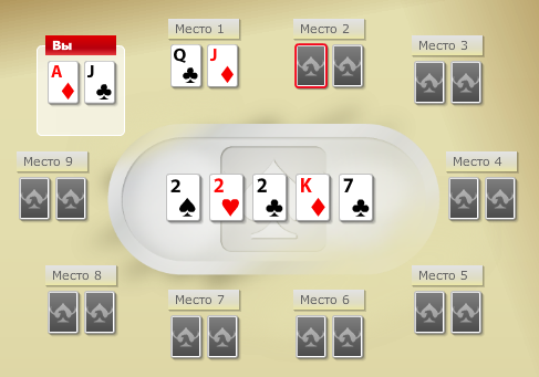 Получается, что три двойки являются общими. А значит, у нескольких игроков такой расклад. Победитель в подобной ситуации определяется по старшему кикеру. Как мы видим, у нас есть Туз, а у противника – Дама. Партию выигрываем мы, поскольку у нас кикер самого высокого ранга.