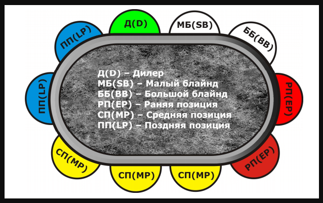 Позиция за столом всегда определяется относительно баттона – кнопки дилера. Те места за столом, которые находятся непосредственно слева от баттона, называются ранними позициями (EP). Места, располагающиеся справа от кнопки дилера, носят название поздних позиций (LP). Между ранними и поздними местами находятся средние позиции (MP).