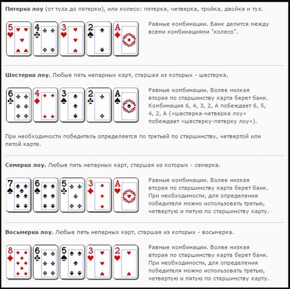 - правило «восемь и лучше» не учитывается – в комбинации могут входить карты любого номинала, но с его увлечением падают шансы на выигрыш в раздаче.