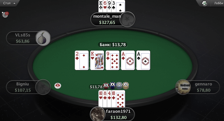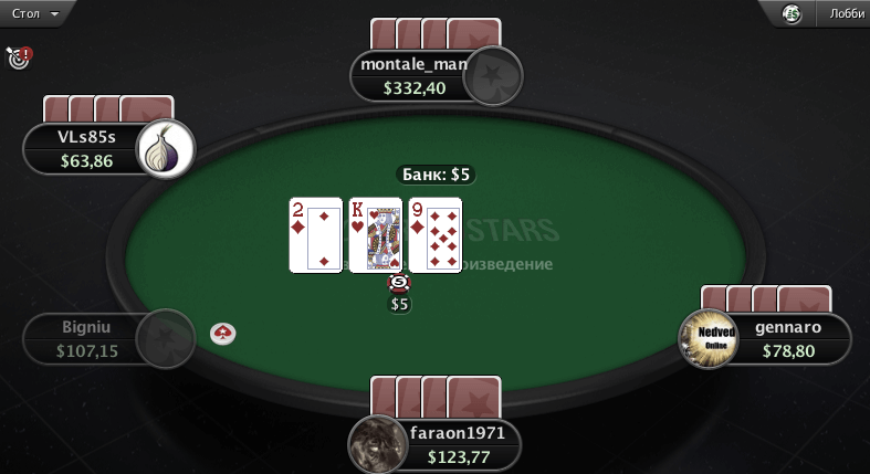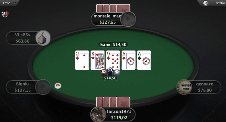 Когда блайнды сделаны, то начинается префлоп – на руки игроки получают по четыре карты и приступают к торгам. Любой из них может сделать фолд или продолжить игру, прибегнув к одному из других ходов.